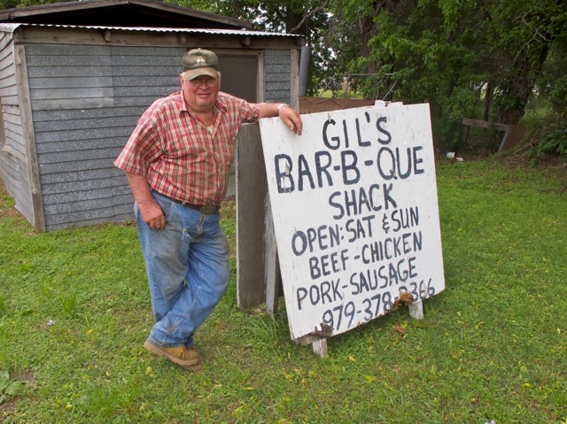 If you’re driving hungry on Highway 71 this weekend, consider skipping the burgers and kolaches at Hruska’s in Ellinger and visiting Gil Vrazel instead. Gil’s Bar-B-Que Shack is that little place just south of Hruska’s that’s only open on Saturday and Sunday. Gil and his wife work at the auction barn in Columbus on weekdays. They smoke their homemade Czech sausage, pork roast and brisket on the weekends only. The old smoker is tucked away in a screened-in shed behind the “main shack” which houses a couple of tables, a fridge for the drinks, and the cash register.