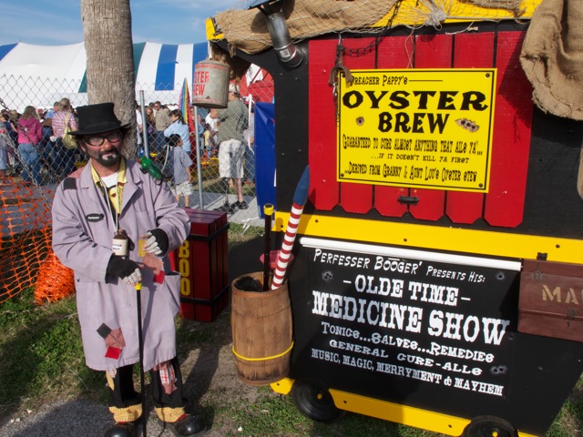 Preacher Pappy won fourth place in the oyster decorating contest at Fulton Oysterfest in 2009. I suspect that this Preacher Pappy Oyster Brew wagon was this year’s entry in the contest. I didn’t try any — not because I don’t believe in the medicinal value of oyster tonic. There simply wasn’t any thing ailing me that a couple of cold beers and a few dozen raw oysters couldn’t cure.