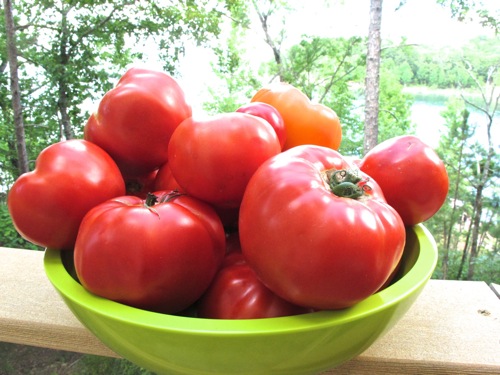 When we vacation at Greer’s Ferry Lake in Arkansas, we get boxes of homegrown Arkansas tomatoes along with cucumbers, okra, peppers, and squash delivered to us courtesy of Bill and Rosie McBroome. The retired couple live just outside of Conway, Arkansas, and they maintain a quarter acre garden that Bill plows by tractor. Bill told me he had harvested around 400 pounds of tomatoes so far this year and his vines would be producing through the summer. Rosie makes tomato juice, canned tomatoes and salsa out of some of the overflow. Bill gave us a box with around 35 pounds of tomatoes in it, neatly stacked with layers of newspaper in between.