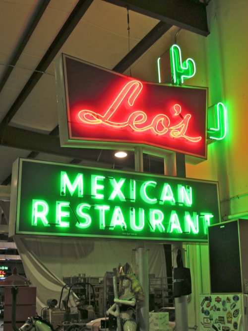 I was visiting the warehouse where Jim Jard works on his hot rods the other day. Jard has a bunch of restored neon signs hanging around the place. I asked him if he had any Tex-Mex stuff. He said, Yeah, look around the other side.” And there it was. The neon sign form the late, great Leo’s. Sadly, Jard isn’t interested in selling it. It’s one of his prize possessions. He said Don Jones at Industrial Neon could easily make a replica though. Bill Floyd, Bryan Caswell and I have been scouting around for Tex-Mex memorabilia for our new and as yet unnamed restaurant. So far, we bought some chairs and memorabilia from Felix, but we are looking for a lot more. If you have some Tex-Mex junk you want to rid of–let me know.
