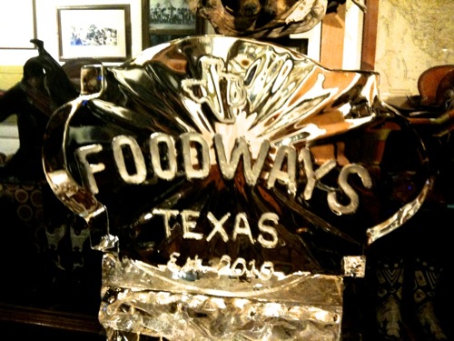 You gotta love a party with an ice sculpture. Last night, Armadillo Palace threw a benefit party for Foodways Texas with decorations that included a frozen rendition of the organization’s logo. Under the melting artwork, Levi Goode made grilled oysters, Chris Shepherd made corned beef sliders, Randy Evans made shrimp corny dogs and Bryan Caswell made those shrimp shots that were featured on Iron Chef. Rebecca Masson made sorghum syrup cookies for dessert. Beer from Saint Arnold’s and vodka from Dripping Springs were consumed in volume.