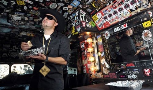 Chingo Bling enjoys a taco dinner before performing at the Key Club in West Hollywood.